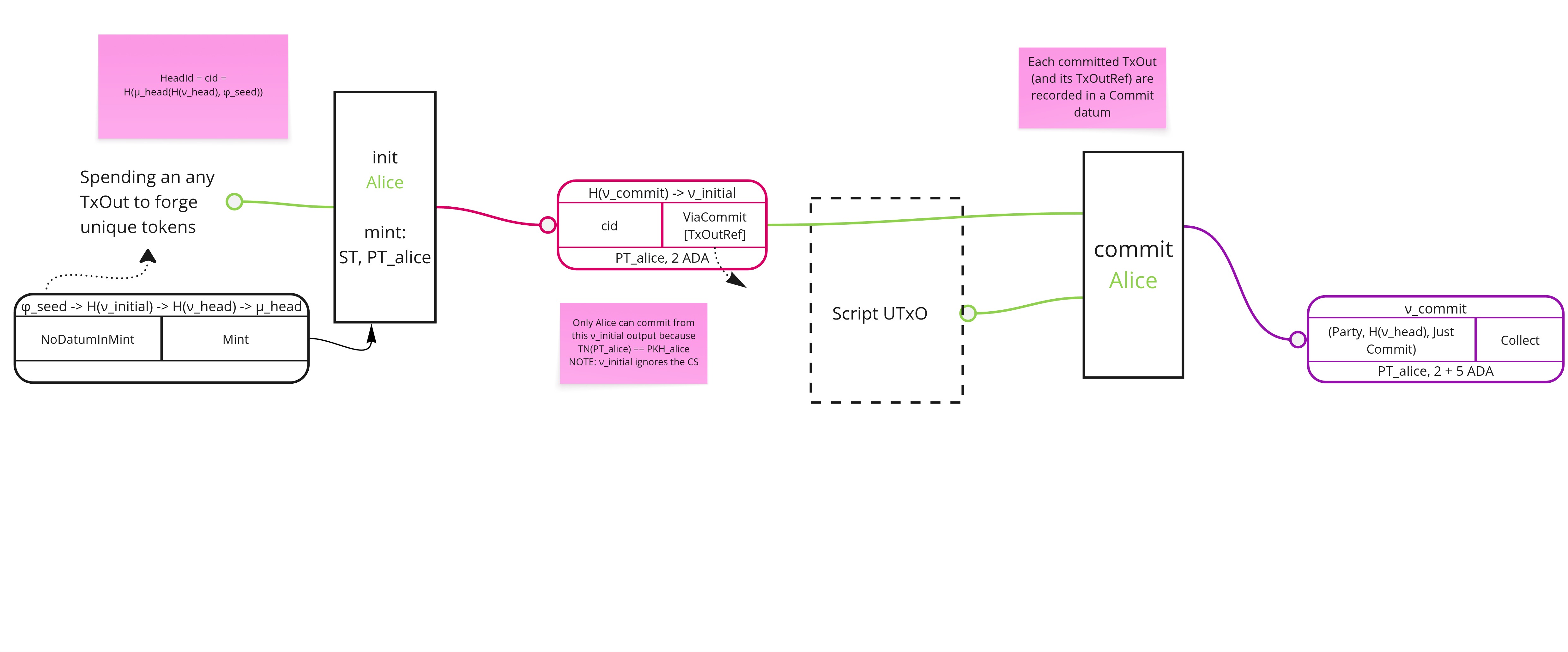 The commit transaction utilizes an initial output specifically crafted for each Hydra Head participant. This initial output includes the HeadId in its datum, while the redeemer contains details about the specific TxOutRef values to be committed, which are pre-sorted.